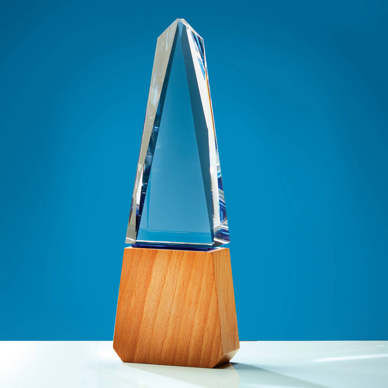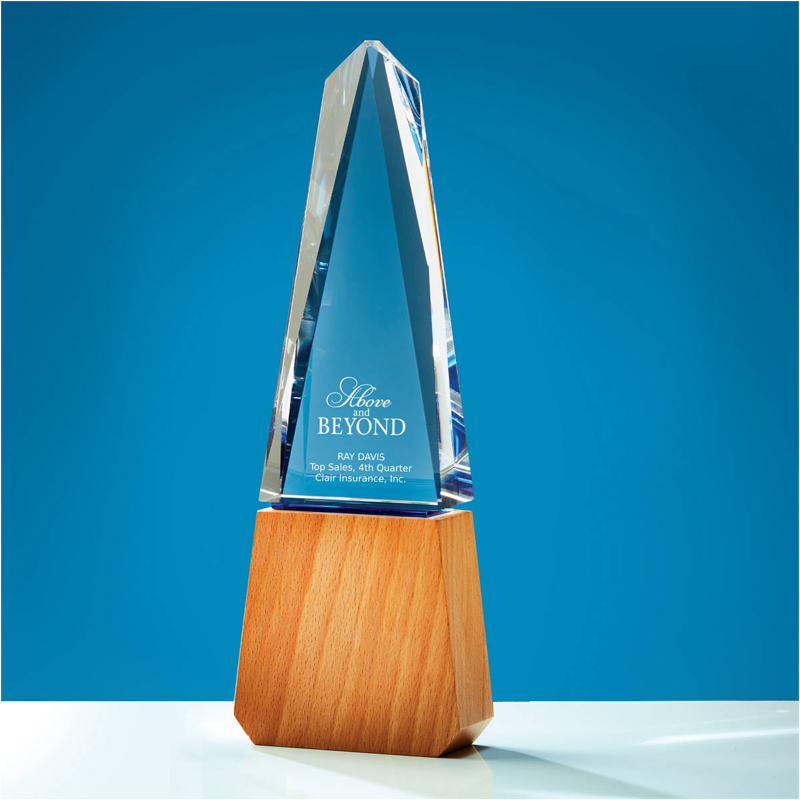 Wood base and blue accented crystal makes your recognition stand out.