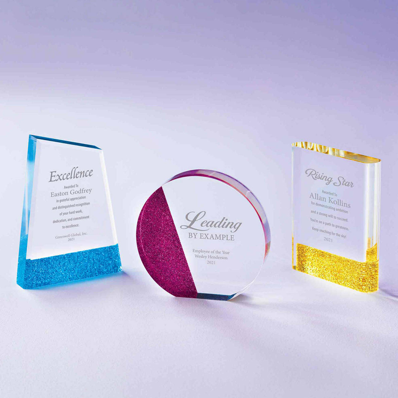 Fun glitter accented acrylic trophy is a stylish way to award!