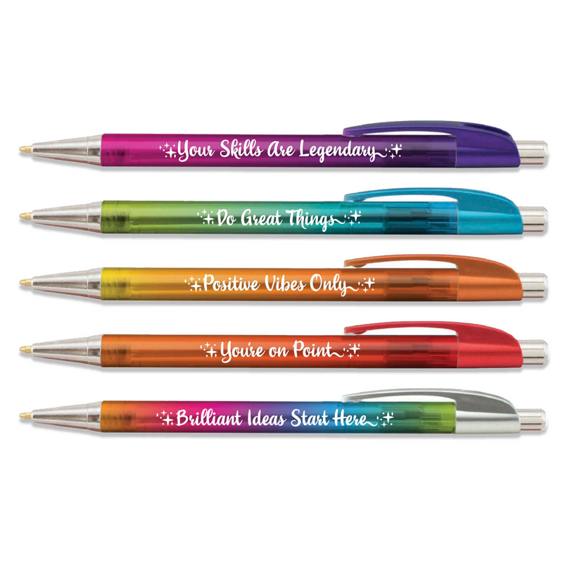 The ombre effect on the translucent plastic pen barrels create a trendy look!